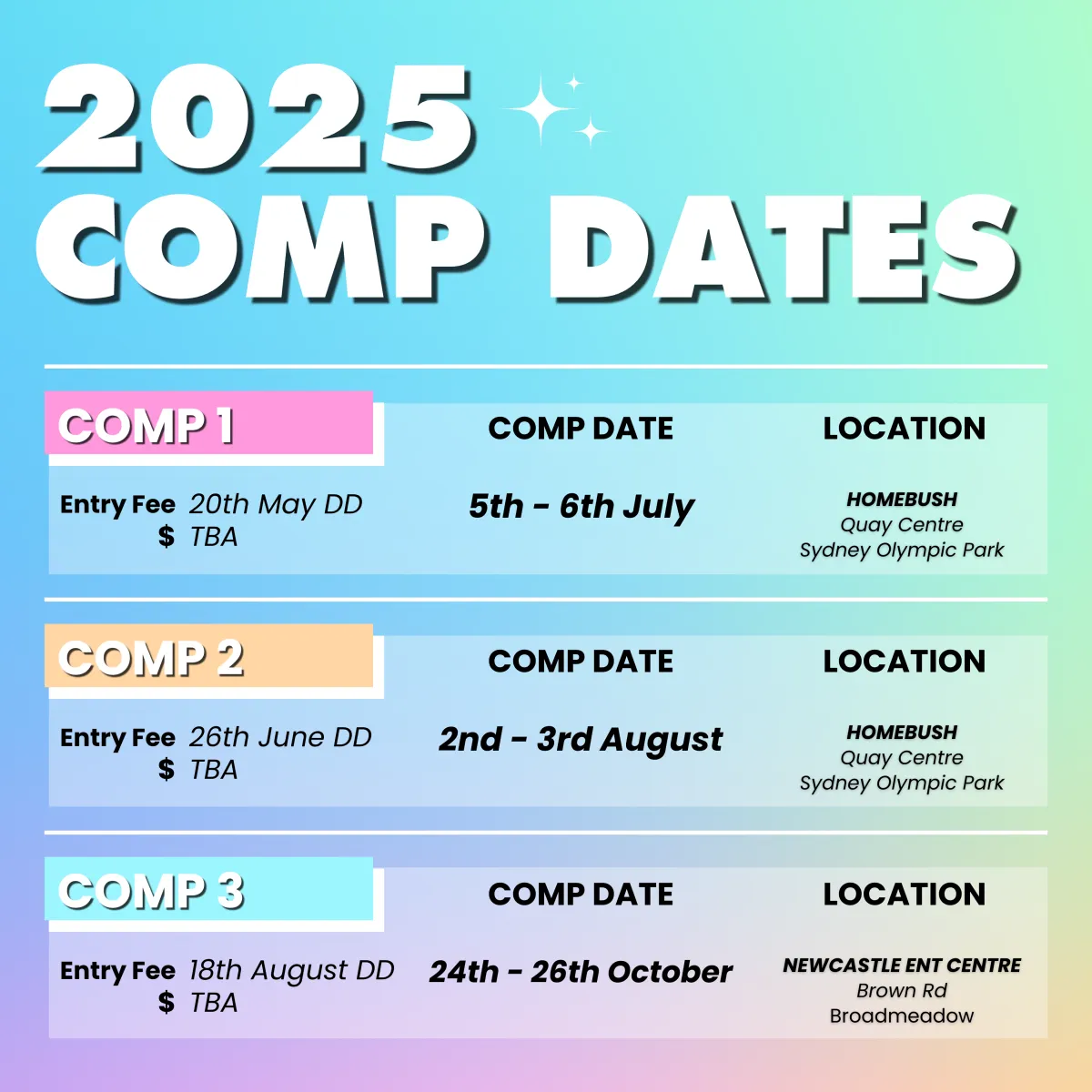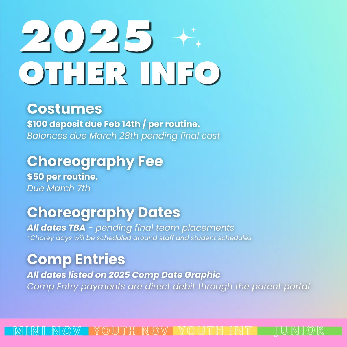 Entry Payments: All competition entry fees are paid via Direct Debit on your parent portal. All debit dates are listed on the above graphic.